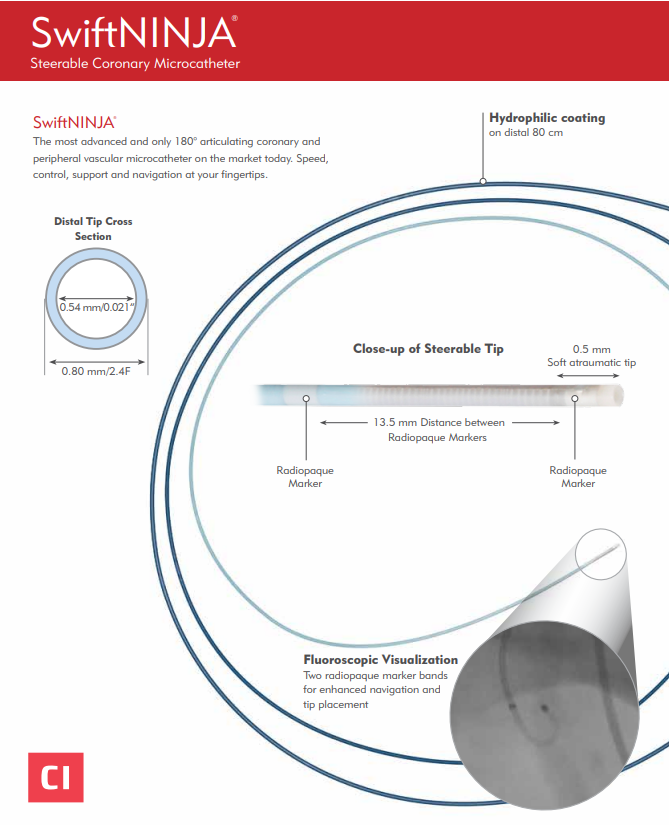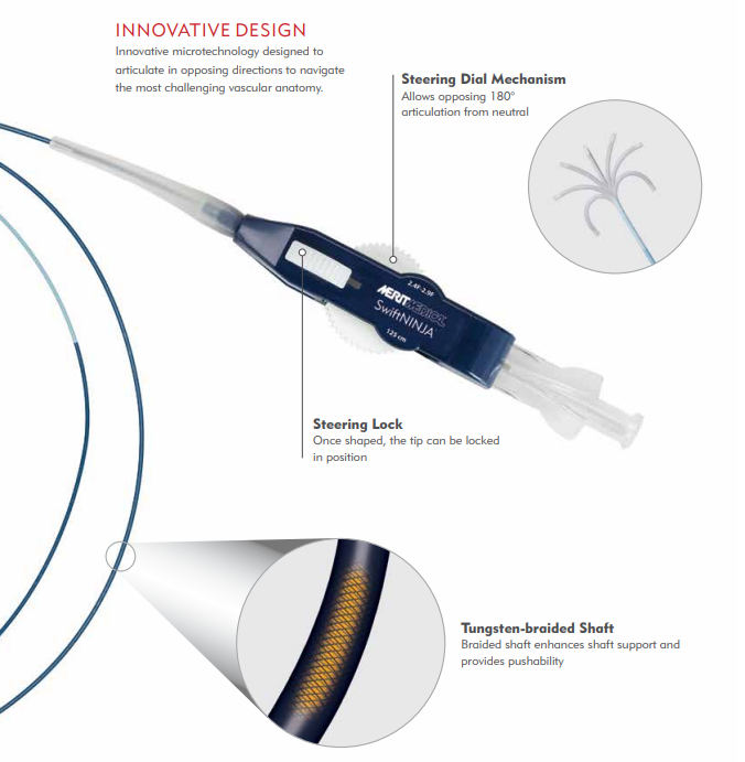 SwiftNINJA, a straight tip catheter that articulates up to 180 degrees in opposing directions to rapidly select the most challenging vascular ostium. Speed, Control and Delivery at your fingertips.