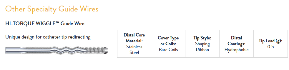 The HI-TORQUE WIGGLE™ Guide Wire is intended to facilitate the placement of the catheter by orienting the catheter tip during percutaneous transluminal coronary angioplasty (PTCA), percutaneous transluminal angioplasty (PTA) and other interventional diagnostic or therapeutic procedures.