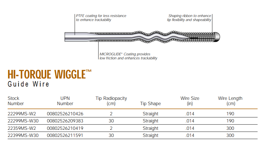Abbott 22299M-W2 HI-TORQUE WIGGLE™ Guide Wire .014 Straight Tip 2.0 cm x 190cm, with Microglide® Coating. Box of 05