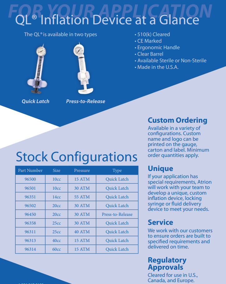 Atrion’s QL® Inflation Devices are perfect for a broad range of applications such as balloon catheterization, stent deployment and fluid delivery.