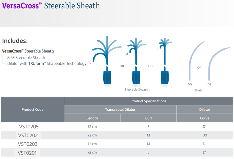 The VersaCross™ Steerable Sheath kit is indicated for introducing various cardiovascular catheters to the heart, including the left side of the heart through the interatrial septum.