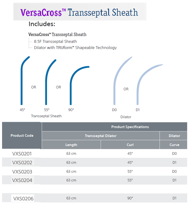 The VersaCross™ Transseptal Sheath kit is used for the percutaneous introduction of various types of cardiovascular catheters and guidewires to all heart chambers, including the left atrium via transseptal perforation / puncture