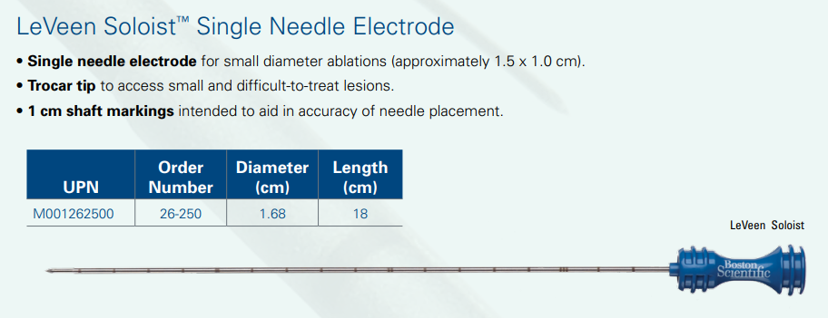 Boston Scientific M001262500 LeVeen Soloist™ Single Needle Electrode 16.5 ga, 26-250, Active Electrode Length 0.9 cm, Cannula Length 18 cm. Box of 01
