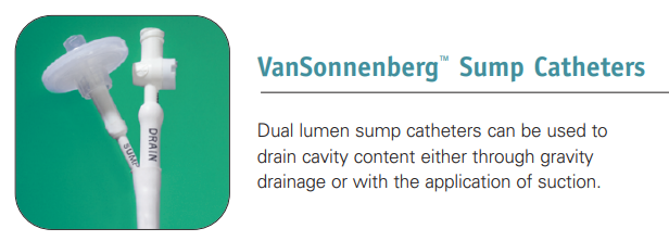 The vanSonnenberg™ Sump Catheter is designed for use as a percutaneously placed drain for intra-abdominal fluid collections. Such conditions include abscesses, cysts, pseudocysts, bilomas, hematomas, seromas, urinomas, or any loculated fluid collection