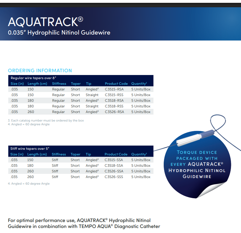 GUIDEWIRE VASCULAR AQUATRACK HYDROPHILIC COATED NITINOL CORE WIRE 150CM OD 0.035IN REGULAR STIFFNESS SHORT TAPER ANGLED TIP
