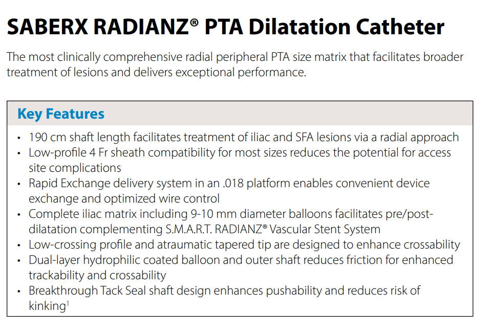 SABERX RADIANZ® PTA Dilatation Catheters provide a clinically comprehensive PTA-size matrix in an .018” rapid-exchange catheter that can be delivered radially.