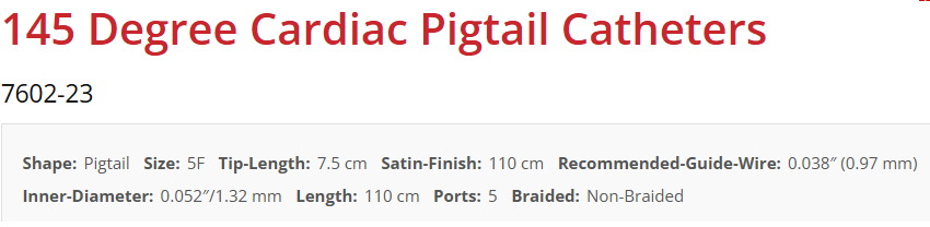 Medical 7602-23 Performa® 145 Degree Cardiac Pigtail Catheters, 5 Fr X 110 cm, non-braided pig, Box of 05