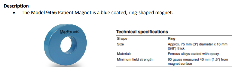The Medtronic 9466 Patient Magnet is a blue, ring-shaped magnet used to temporarily change the function of compatible Medtronic implantable cardiac devices. The magnet affects the device's function as long as it is held directly over the implant site.