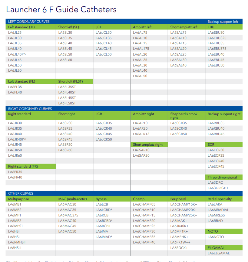 Launcher LA6MP1A is a specific model of a guide catheter used in coronary and peripheral vascular procedures to provide a pathway for introducing therapeutic devices. LA6MP1 has a 6 French diameter, a 100 cm length (the 'A' in the model number has 110 cm length)