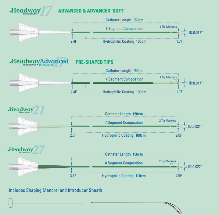 Headway® microcatheters offer a wider selection of access solutions. With three sizes, two levels of support and three pre-shaped tip options available, there is a Headway microcatheter available for use in nearly any procedure.