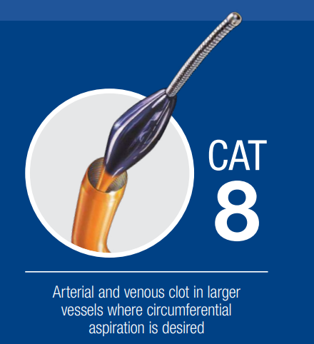 Continuous Aspiration Mechanical Thrombectomy Catheters (CAT) are the foundation of Penumbra’s Indigo® System. The four catheters—CAT3, 5, 6, & 8—are robust, durable, trackable, and suited for the peripheral anatomy. Available in a selection of sizes, the CAT family can provide access to distal peripheral vessels of the upper and lower extremities, including below the knee.