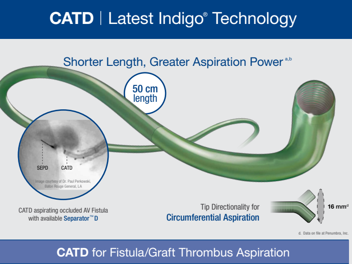 Continuous Aspiration Mechanical Thrombectomy Catheters (CAT) are the foundation of Penumbra’s Indigo® System. The four catheters—CAT3, 5, 6, & 8—are robust, durable, trackable, and suited for the peripheral anatomy. Available in a selection of sizes, the CAT family can provide access to distal peripheral vessels of the upper and lower extremities, including below the knee.