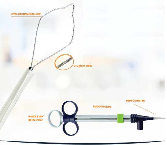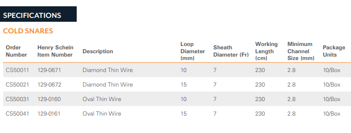 Description Description Micro-Tech CS3-11023230 Cold Snare, CS50011 Diamond Thin Wire 10mm X 230cm X 2.8mm. Box of 10 Designed specifically to resect diminutive polyps, the Micro-Tech cold snare is available in two sizes, 10 mm and 15 mm. The thin cutting wire provides for a guillotine-type cut while the loop shape assists in capturing smaller polyps. A stiffer catheter aids in insertion through an extended scope position while providing support during resection. These features combine to provide an effective, efficient and economic solution to resecting diminutive polyps. KEY BENEFITS DEDICATED COLD SNARE Specifically designed for resecting diminutive polyps using a cold snare technique, the oval or diamond shape loop and flexible wire, capture smaller polyps with ease. THIN WIRE The thin 0.23 mm cutting wire provides a guillotine cut that reduces the force needed to complete the resection and may limit tearing or snagging. COMFORTABLE ERGONOMIC HANDLES Accomodating various hand sizes, the ergonomic three-ring handle features a shortened throw and comfortable grip. The stiff catheter provides support for a smooth effortless cut. View AllClose