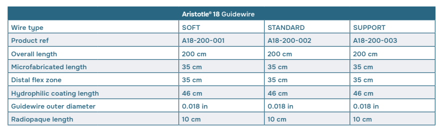 - Increased distal tip softness in comparison to the Aristotle® 14 that doesn’t compromise on desired support within the proximal end of the wire.
