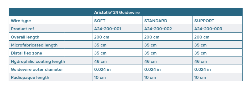 The Aristotle® 24 Guidewire is intended for general vascular use within the neuro and peripheral vasculatures to introduce and position catheters and other interventional devices. The guidewire is not intended for use in the coronary vasculature