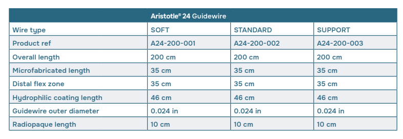 The Aristotle® 24 Guidewire is intended for general vascular use within the neuro and peripheral vasculatures to introduce and position catheters and other interventional devices. The guidewire is not intended for use in the coronary vasculature