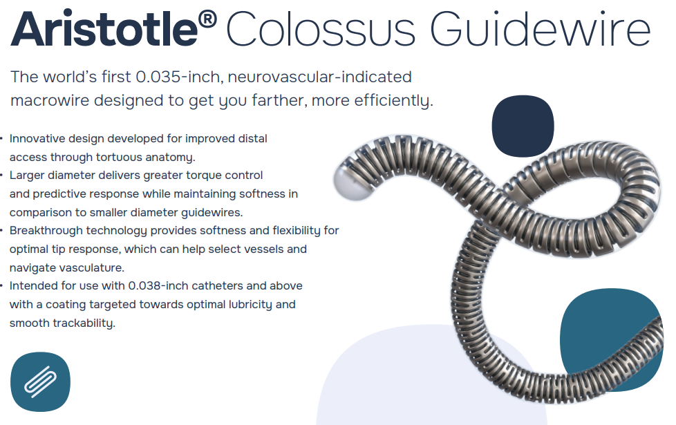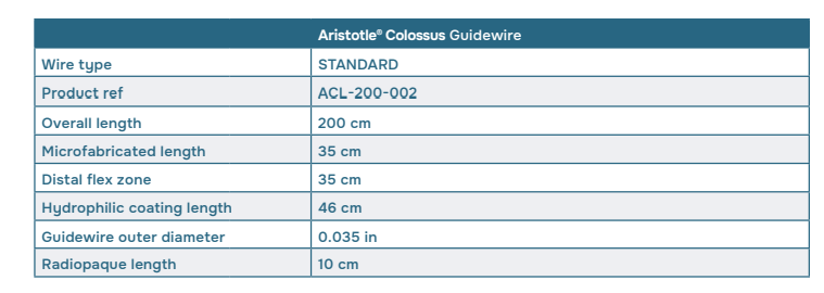 The Aristotle® Colossus Guidewires are for general vascular use within the neuro and peripheral vasculatures to introduce and position catheters and other interventional devices. The guidewire is not intended for use in the coronary vasculature.