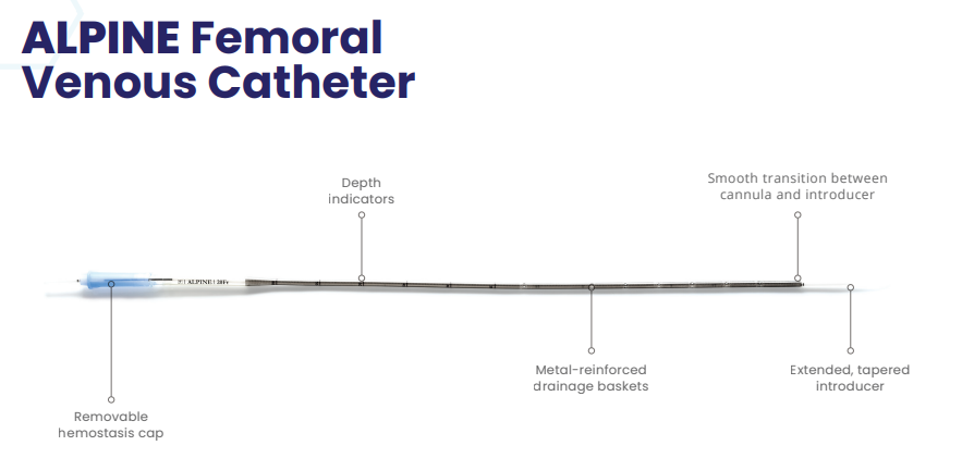 - The ALPINE FVC is designed with a tapered distal tip and mating extended introducer to provide smooth insertion into the femoral vein and navigation up to the SVC.