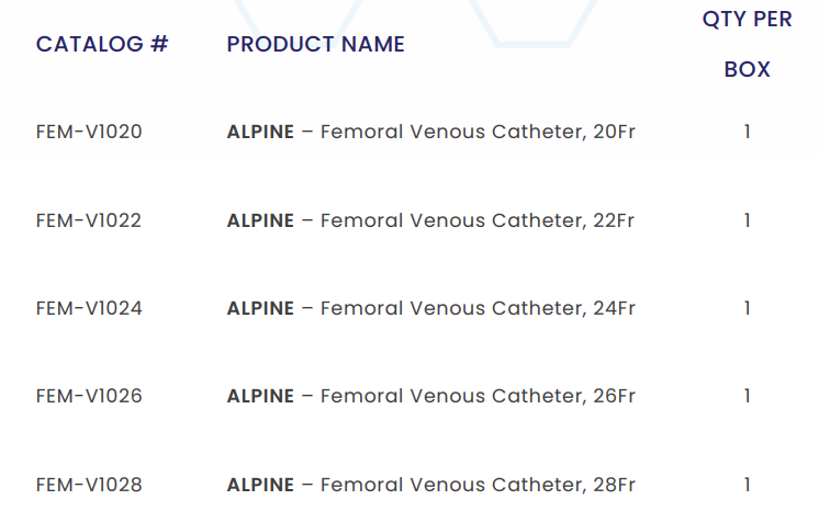 - The ALPINE family of Femoral Venous Catheters are available in FIVE diameters, from 20Fr through 28Fr, to accommodate various patient sizes and surgical preferences.