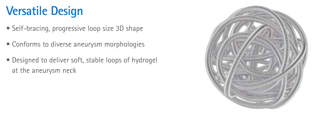 Family of complex coils with the familiarity of bare platinum and the proven benefits of hydrogel technology. The coils are available in a wide range of sizes for both the 10 and 18 systems, providing versatility for framing and filling.
