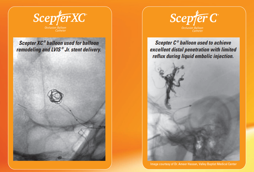 The Scepter C and Scepter XC Occlusion Balloon Catheters are intended: For use in the peripheral and neuro vasculature where temporary occlusion is desired. The balloon catheters provide temporary vascular occlusion which is useful in selectively stopping or controlling blood flow.
