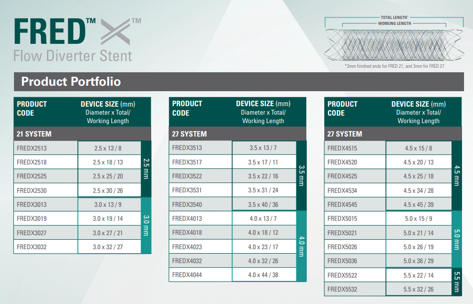 The FRED™ X System is indicated for use in the internal carotid artery from the petrous segment to the terminus for the endovascular treatment of adult patients (22 years of age or older) with wide-necked (neck width ≥ 4 mm or dome-to-neck ratio < 2) saccular or fusiform intracranial aneurysms arising from a parent vessel with a diameter ≥ 2.0 mm and ≤ 5.0 mm.
