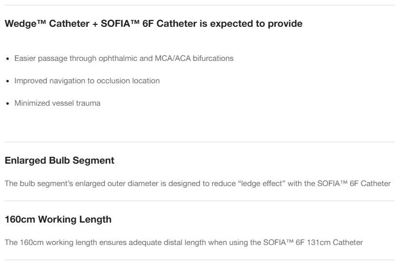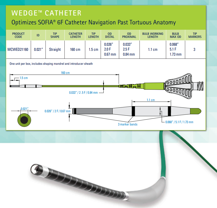The Wedge™ Microcatheter optimizes SOFIA™ 6F Catheter navigation past tortuous bifurcations allowing SOFIA™ 6F Catheters to access extremely challenging occlusion locations