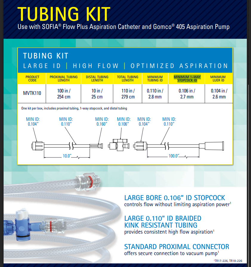- Terumo Neuro's Tubing Kit is designed to connect to the Gomco™ aspiration pump and provide high flow vacuum to the SOFIA™ Flow Plus aspiration catheter